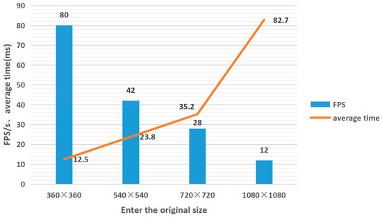 As the input image size increases, the algorithm’s running time also increases. The speed tests are performed on images with different resolutions, and the test results are shown in Figure 8. The figure displays the consumed time (in milliseconds) and FPS for images of different resolutions. The bar chart represents the average FPS of the output displayed after the input image is SR four times, and the line chart represents the stable single-frame time consumption. The maximum frame rate was 80 FPS for the 360 × 360 image, and the average elapsed time was 12.5 ms per frame.