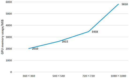 As the resolution increases, the GPU memory usage also increases. The test results about GPU memory usage of video streams with different resolutions are shown in Figure 9. Among them, the minimum memory usage is 2010 MiB at a resolution of 360 × 360. With the increase of resolution, the memory usage shows a clear upward trend, and reaches 5810 MiB at a resolution of .
