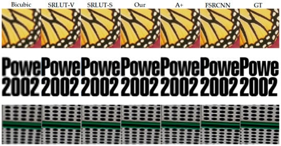 The SR comparison results are shown in Figure 10. Based on visual inspection, the proposed method exhibits prominent restoration effects compared to bicubic interpolation and shows better sharpness in some detail recoveries than SR-LUT-V/S.