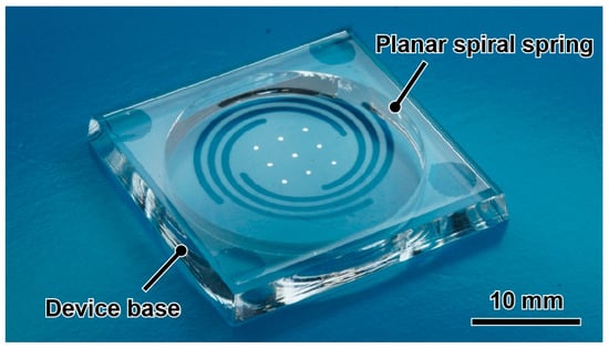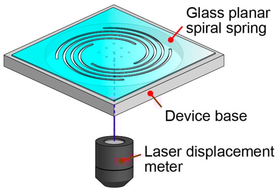 Thus, the proposed force plate comprises a 25-µm-thick glass plate with a planar spring structure. A laser displacement meter was positioned beneath it to measure the vertical displacement at the center of the plate. A planar spring structure can be easily fabricated using laser processing. Recently, laser processing has been widely used in microfabrication [,]. A previous study developed a force plate using a 100-µm-thick polyimide film [], and the device achieved a resolution of less than 0.02 µN, thereby demonstrating its suitability for measuring the body weight and mass of each body part of a fruit fly. However, despite its easy handling and unbreakable characteristics, polyimide is unsuitable for long-length measurements owing to its viscoelastic properties, which cause gradual deformation after a large load is applied. This causes difficulties, such as requiring a long time to return to the zero point and easily shifting to the zero point.
