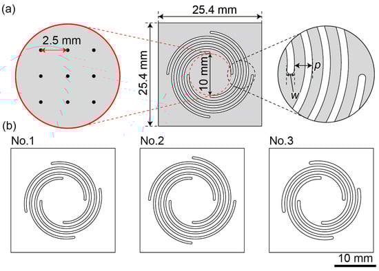 A schematic of the proposed planar spiral spring is shown in Figure 2a, and the parameters for each of the three spirals are listed in Table 1. The device has a square of side 25.4 mm with a plate of diameter of 10 mm at the center, from which four spiral shapes were removed. In this study, the pitch p of each spiral was 1.25 mm, and the mechanical properties, such as the spring constant and resonant frequency, were adjusted by varying the cutting width w and the number of turns N. The arrangement of the nine points such that they accurately determine the center of the plate and assess corner-weighing differences is shown in Figure 2a. To avoid stress concentration, a rounded shape with the same diameter w was formed at the beginning and end of the spiral.