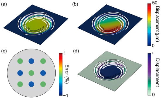Therefore, F is calculated using the premeasured spring constant and measured displacement. If the four springs are mechanically identical, the applied force can be calculated solely by the total spring constant and center displacement, regardless of the position of the applied force []. Positional errors may arise if variations exist among the four springs or if the measurement point deviates from the center. Thus, precise fabrication and alignment are important.