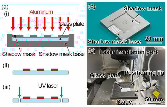 (a) Fabrication of the force plate. (i) Aluminum deposition using the shadow mask. (ii) After aluminum deposition. (iii) Cutting the glass wafer with UV laser processing machine. Photographs of the (b) shadow mask system and (c) alignment of the UV laser machine.