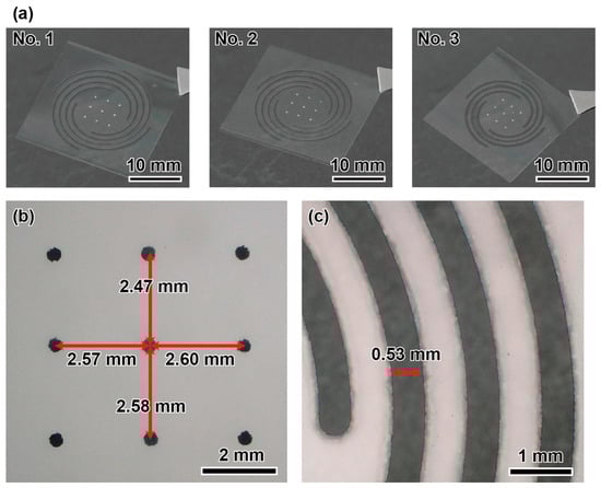 Figure 5a shows the fabricated force plates according to the parameters and designs (Nos. 1–3) shown in Figure 2, respectively, whereas Figure 5b,c shows the close-up images focusing on the plate center and spiral, respectively. The sides of the UV laser-irradiated glass had no cracks. Regarding the deposition process, nine points were first deposited as easily visible dots. The distance between each point was 2.47–2.60 mm, which is within a 5% error range compared with the designed distance of 2.5 mm. Compared with previous landmarks on the force plate, such as the grid lines of the MEMS force plate array [], the error range was large, owing to the shadow-mask process. However, there was little influence on the calibration. The lengths from the center point of the aluminum deposition to the spiral end points were distributed in the range of 4.82–5.23 mm, which is also within a 5% error range. Possible sources of error include the dimensional error of the shadow mask during deposition and errors in the installation of the glass plate during laser processing. In addition, the cutting width w was approximately 30 µm larger than the designed value; this error occurred owing to the spot diameter of the UV laser. Figure 6 shows a photograph of the force plate attached to a device base fabricated by machining an acrylic plate of a height of 3 mm.