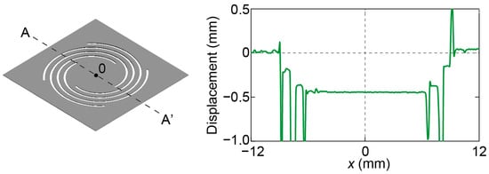 The displacement of the fabricated device with plate No. 1 under its own weight measured by a laser microscope (VR-5000, Keyence Corporation, Osaka, Japan) is shown in Figure 7. The plate initially sank approximately 0.5 mm in the center. This displacement is reasonable considering the plate weight and designed spring constant.