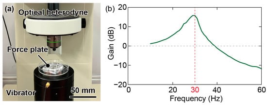 (a) Photograph of the experimental setup for evaluating the resonant frequency. (b) Frequency response of force plate No. 1.