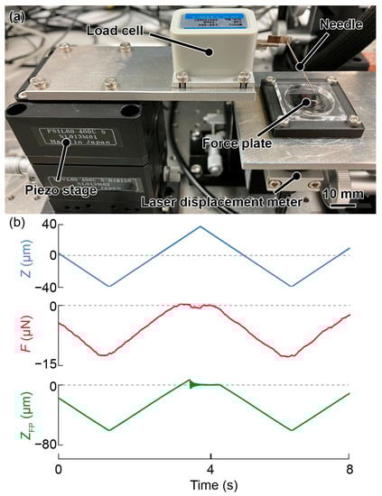 The experimental setup to evaluate the responses to the force is shown in Figure 9a. A load cell (LVS-5GA, Kyowa Electronic Instruments Co., Ltd., Chofu, Japan) was placed on a piezo stage (PSVL-400U-S, THK PRECISION Co., Ltd., Tokyo, Japan) and a needle was placed on the load cell. A multicolor confocal laser displacement meter (CL-L015 and CL-3050, Keyence Corporation, Osaka, Japan) was placed under the plate to detect the displacement at the plate center. The laser displacement meter was almost independent of temperature (0.005% F.S./°C). In principle, any type of external laser displacement meter, such as an interferometer or triangulation method, can be used.