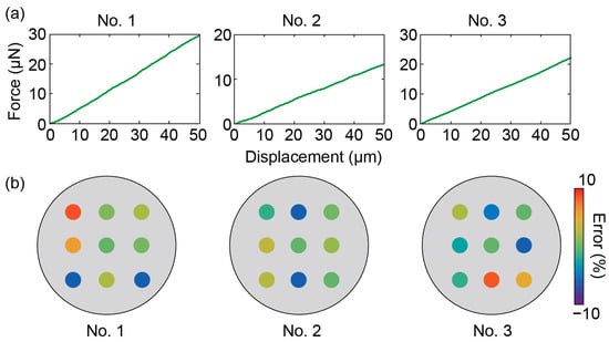 The position error distribution of the spring constant was experimentally evaluated by pushing the nine points of the aluminum pattern. The experimental position error in the spring constant is shown in Figure 10b. The position error was within ±10% for each plate. Unlike in the simulation, no regularity was observed in the distribution, and it was slightly larger than that in the simulation. A summary of the experimental results is provided in Table 4.