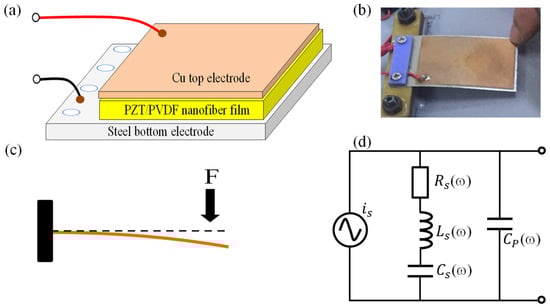 (a) Device structure of sensor; (b) photo of flexible piezoelectric sensor; (c) illustration of the operation of the sensor; (d) equivalent circuit of sensor.