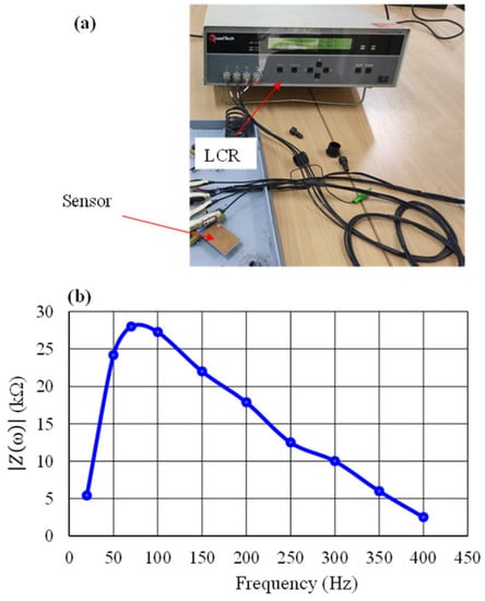 We performed an additional experiment on the impedance measurement using QuadTech LCR Meters, as shown in Figure 2a. The modulus of Z was calculated with Equation (2) using the measured values of the reactive and real part at the frequency from 20 Hz to 400 Hz. As can be seen in Figure 2b and Table 1, the resonant frequency is about 75 Hz, which will be used in our further experiments (shown in Section 4). The Z modulus values in Table 1, ranging from 2.52 kΩ to 28.2 kΩ, are relatively high. However, they are similar to those reported in previous work [].