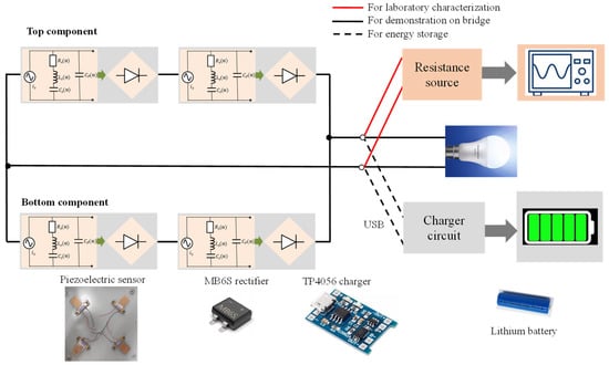 The electronic circuit diagram of the energy transducer is shown in Figure 3. In order to double the current and voltage, a structure of four piezoelectric sensor panels was designed. Two components were connected in parallel; meanwhile, in each component, a pair of sensors was connected in series. Here, we have not utilized many sensors due to the problems of parasitic capacitance and device–device capacitance occurring during the device’s operation, which cause low responsivity [,,,,,,,,,]. A rectifier circuit using a four-diode bridge device (MB6S, Fairchild, WI, USA) was attached to convert AC values to DC values. A TP4056 (ICSTORE, Delhi, India) charging circuit was used to connect a lithium battery and a rectifier.