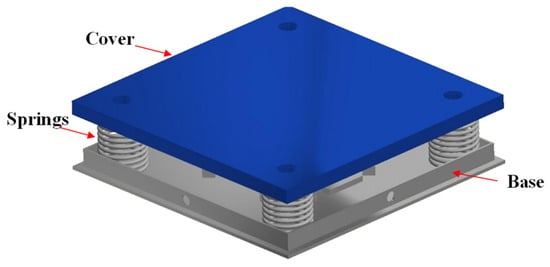 For the device’s mechanical design, we used SolidWorks 2022 to render the harvesting transducer tile, as shown in Figure 4. The harvesting transducer was designed with dimensions of 400 mm × 400 mm × 70 mm, which are equal to those in tiles widely used for bridge floor construction.