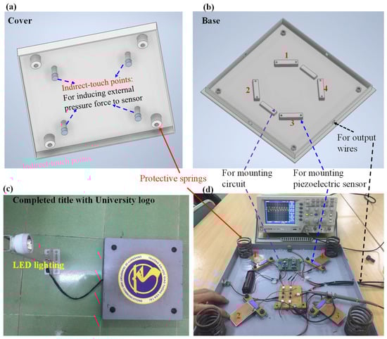Diagrams of (a) cover and (b) base and photos of overall view (c) and inside view (d) of piezoelectric energy-harvesting tile transducer. Each sensor in (d) was numbered corresponding to its location designed in (b).
