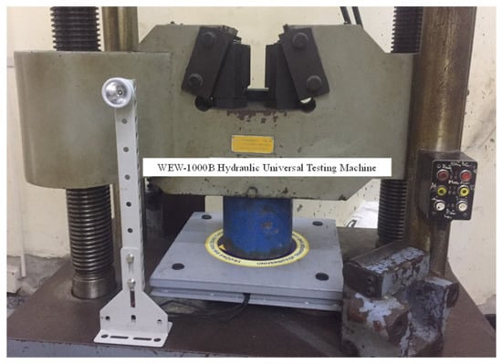 As shown in a photo in Figure 6, the piezoelectric energy-harvesting transducer was placed inside a press machine (WEW-1000B Hydraulic Universal Testing Machine (Chenda tester, Shandong, China) to measure the device’s pressure and displacement dependances. A decade resistance standard resistor (279301, Yokogawa, Musashino City, Japan) was connected to the piezoelectric tile in order to analyze the performance of the energy-harvesting transducer tile at various resistive loads. The electrical output was measured using an oscilloscope (GW INSTEK GDS-1052-U, Taipei, Taiwan). The effects of pressure on the device’s electrical properties at a displacement of 2.5 mm and a load resistance of 15 kΩ are shown in Figure 7. We found that the minimum pressure required to activate the harvesting transducer is 5 kPa. The output voltage and output power increased significantly in the human foot pressure range of 50–100 kPa [] and were able to withstand a maximum car-on-road pressure of 150 kPa [], which suggests that the tile device can be used to absorb energy from the movement of a human or a car.