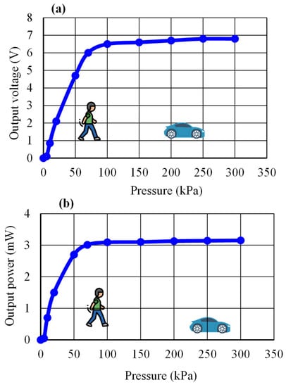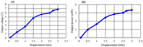 With regard to another important aspect, the displacement dependence of output voltage and output power are shown in Figure 9a,b, respectively. When the displacement parameters were controlled to vary from 1 mm to 3 mm, all measurements were performed at a load resistance of 15 kΩ and a pressure of 70 kPa. As presented in Figure 9, the output voltage or output power values increased with increasing displacement. A previous work [] indicated that to meet practical operations on the floor or the road, the displacement of the tile should be 2.5 mm. By considering such a recommendation and our experimental data presented in Figure 9, we also selected 2.5 mm as the displacement value of our harvesting transducer tile.