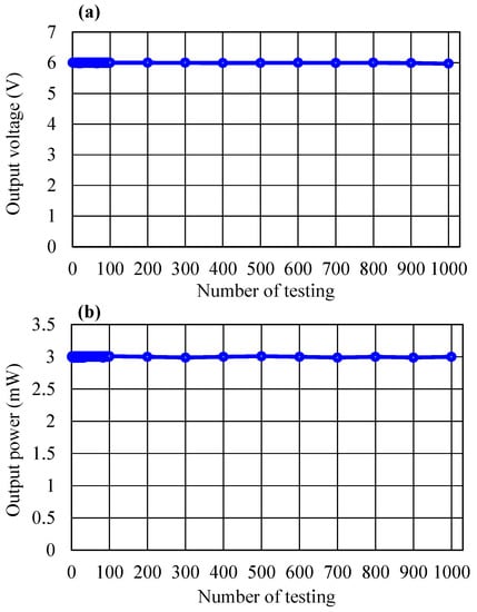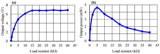 Figure 8 shows the output voltage and output power of the piezoelectric energy-harvesting transducer as a function of the load resistor at a displacement of 2.5 mm and a pressure of 70 kPa. The output voltage was proportional to the load resistor values, and the maximum output voltage observed was 6.8 V at 15 kΩ. Meanwhile, the output power increased rapidly to a maximum value of 4.8 mW at 5 kΩ and gradually decreased afterward, as shown in Figure 8b. The saturated values of the output voltage and output power are relatively lower than those in the previous works [,,,] because we only used four sensor panels in the harvesting transducer.