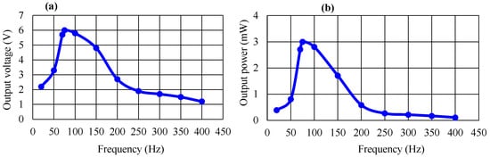 Figure 10 shows the dependences of the output voltage and output power of the piezoelectric energy-harvesting transducer on the frequency of the applied force. Experiments were performed at a displacement of 2.5 mm and a pressure of 70 kPa. The output voltage and output power were observed to increase with an increasing frequency, attaining maximum points at 75 Hz and then decreasing gradually. The tendency in Figure 10 is consistent with that in Figure 2b.