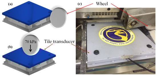 The symmetrical placement of the piezoelectric sensors was designed to maximize the induced force applied to any location on the surface of the tile. Four springs with a height of 60 mm, a diameter of 48 mm, and a constant of 1.32 kgf/mm were mounted at the four corners of the frame. The designed tile had a maximum displacement of 3 mm. In addition, to more effectively protect the sensor, indirect touch points were placed on the cover of tile. It should be noted that our energy-harvesting transducer does not pose a risk of destroying the piezoelectric sensor because the impact is transferred to the piezoelectric panel via four indirect touch points and the vertical movement of the cover is limited to 3 mm via the protection springs. For fabrication, the case, frame, and cover were carefully made using a low-cost iron alloy material. Photos of completed piezoelectric energy-harvesting transducer tile are shown in Figure 5.