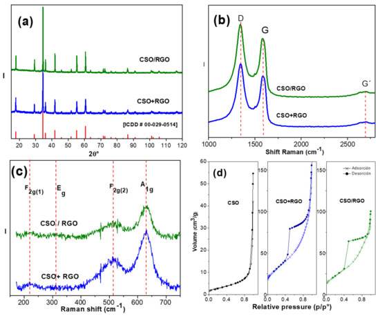On the other hand, group theory analysis predicts 42 vibrational modes in spinel, but only five of them are active in Raman spectroscopy, Γ = A1g + Eg + F2g [32,33,34]. Figure 1c shows a four-phonon mode spinel structure characteristic of CSO in the CSO/RGO and CSO+RGO nanohybrids, 630 cm−1, 510 cm−1, 310.7 cm−1 and 216.7 cm−1 for A1g, F2g(2), Eg and F2g(1), respectively. The peaks are not very well defined, attributed to the dark color of cobalt oxide, which reduces the penetration depth of the excitation laser beam, which also makes it difficult for not all the vibrational modes to be observed, in this case, vibrational mode F2g(3).