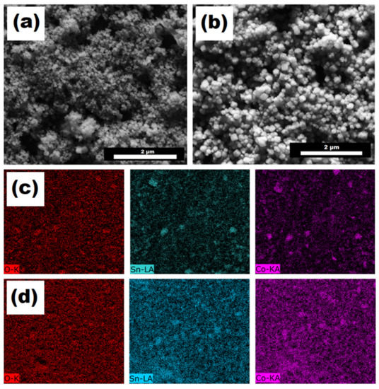 SEM micrographs of (a) CSO+RGO and (b) CSO/RGO. EDX mapping (oxygen, tin, and cobalt) of (c) CSO+RGO and (d) CSO/RGO.