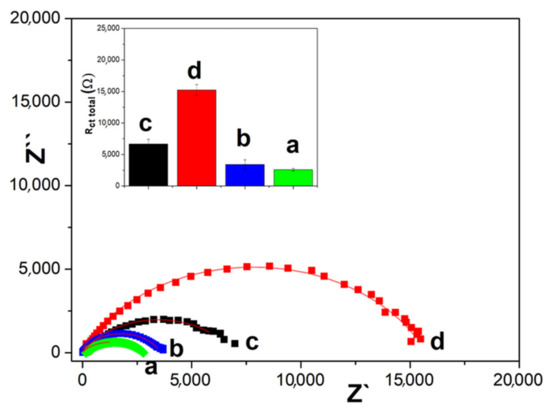 Nyquist plot of 10 mM hydrogen peroxide solution as a redox probe on: a. CSO/RGO, b. CSO+RGO, c. RGO, d. CSO. Figure Inset: Total resistance and equivalent circuit.