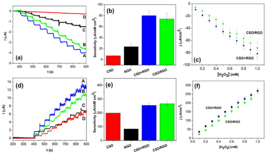 The electroanalytical response of the modified electrodes was evaluated by amperometry. Ten successive recordings were analyzed after the addition of 0.10 mM H2O2 in NaOH pH 12 solution. A detection potential of −0.400 V or 0.300 V for the reduction or oxidation of H2O2 was applied. Figure 4a shows the amperograms for the reduction of hydrogen peroxide using modified electrodes with the in situ and ex situ hybrids, CSO and RGO. The sensitivity to H2O2 detection normalized by the electroactive area was calculated from the amperograms (Figure 4b). A pronounced increase in the sensitivity with hybrid nanomaterials is observed with synergy by potentiation in their response since the values do not correspond to the sum of the sensitivities of CSO and RGO individually. The sensitivities of the CSO/RGO in situ and CSO+RGO ex situ nanohybrids are similar, in agreement with the impedance results.