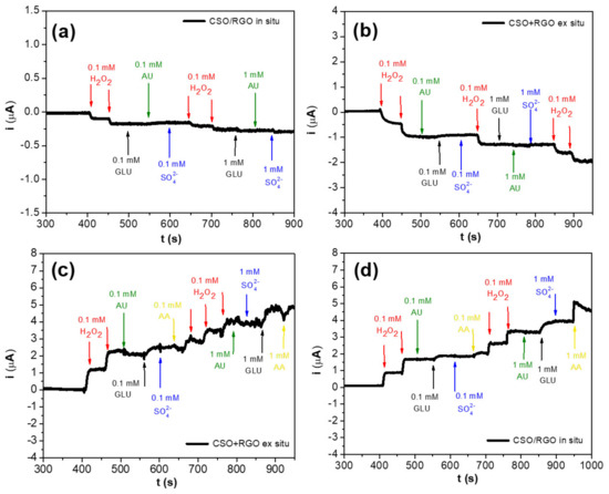 Amperometric responses to successive additions of 0.1 mM and 1.0 mM H2O2, uric acid (AU), glucose (GLU), sodium sulfate (SO42−) and ascorbic acid (AA): (a) reduction for CSO/RGO in situ and (b) reduction for CSO+RGO ex situ electrodes at −0.400 V applied, (c) oxidation for CSO+RGO ex situ (d) oxidation for CSO/RGO in situ electrodes at 0.300 V applied.