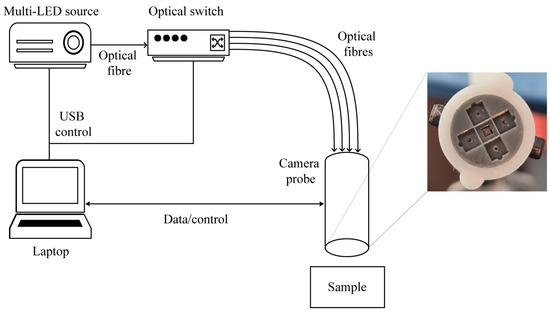 The optical fibres allow light to be delivered to the sample from four slightly offset illumination locations. A shift in specular surface reflections can thereby be induced which can later be low-pass filtered during post-processing eliminating the more intense surface reflections. A one-to-four optical switch (Leoni mol 1 × 4) allows for quick switching between illumination fibres, minimising effects of movement by allowing for acquisition times of under half a second limited by the synchronisation with the frame grabber. The system is controlled using a LabView (National Instruments, Austin, Texas) based control software. Multiflash images were analysed using a multiflash algorithm [24,25] and reconstructed using a MATLAB v2021a (Mathworks, Natick, MA, USA) code and Poisson image reconstruction based on a sine transform [33,34,35]. The small shift in the location of the specular reflections was used to eliminate the reflections from the image. The choice of fibre to illuminate allows additional flexibility in illumination wavelength selection.
