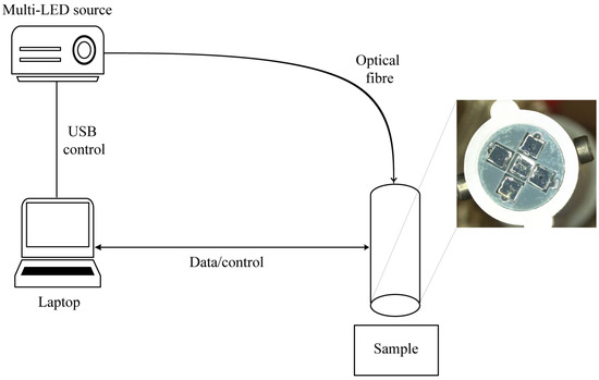 Illumination was delivered using a custom-built, portable, fibre-coupled multi-LED light source, designed and built in house. This work will be published separately. The source is capable of illuminating with five different wavelengths from 400 nm to 940 nm. Wavelengths were selected to allow for the reconstruction of white light using a combination of red (660 nm—Thorlabs M660D2), green (540 nm—Thorlabs M530D3), and blue (450 nm—Thorlabs M450D3) wavelengths. Moreover, two NIR wavelengths were selected to provide deeper penetration depth in tissue. These were at 850 nm (Thorlabs M850D2) and 940 nm (Thorlabs M940D2). The LEDs are coupled into a single optical fibre using an arrangement of dichroic mirrors. This results in a fibre-coupled source which can be used plug and play style with either of the two aforementioned measurement configurations. The wavelengths choices are adaptable and can be adjusted depending on application.