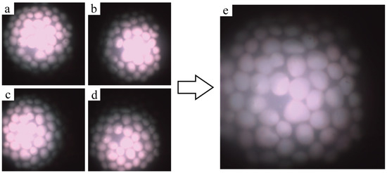 Figure 5 shows an example of the multi-flash system’s image outputs. Each illumination fibre sequentially illuminates the sample, in this case a bare tissue phantom. The four images that are generated can be seen in Figure 5a–d where it is clear that the illumination pattern changes as the scene is illuminated from slightly different positions. The specular reflections present themselves as very bright areas in the center of the illuminated area, where the detector saturates and the hydroxyapetite features are not discernible. The specular reflection shift can also be seen in each of the four images where the saturated region is observed in a different location of the sample. Figure 5e shows the reconstructed output of those four images. The bright saturation due to direct surface reflections is filtered out and the margins of the features are visible once again. The reconstruction error of this method was examined by feeding four identical images into the reconstruction algorithm and analysing the differences. This error in the reconstruction was found to be of the order of .