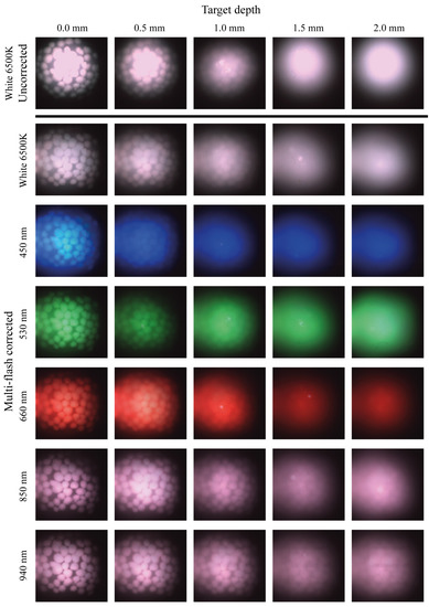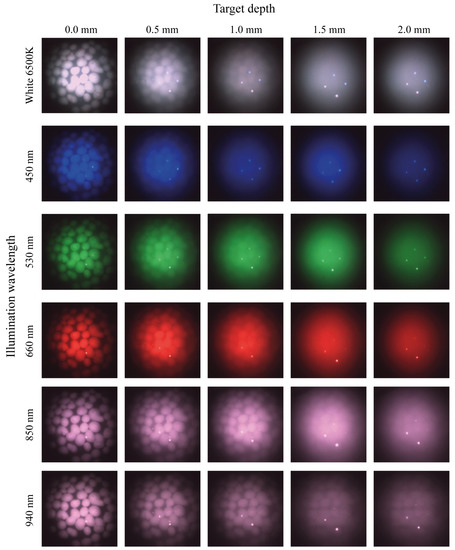 To further explore the reconstruction in terms of wavelength and depth, multi-flash images are presented in Figure 6 below, where the features embedded in the multi-layer phantom are imaged at different imaging depths and using wavelengths from the blue to the NIR. The probes were fixed 8 mm above the sample, and images were captured at a range of imaging intensities, with the best ones for inspection being selected. A similar procedure takes place in clinical situations when examining tissue samples, where the clinician will adjust the system settings until an adequate image is generated.