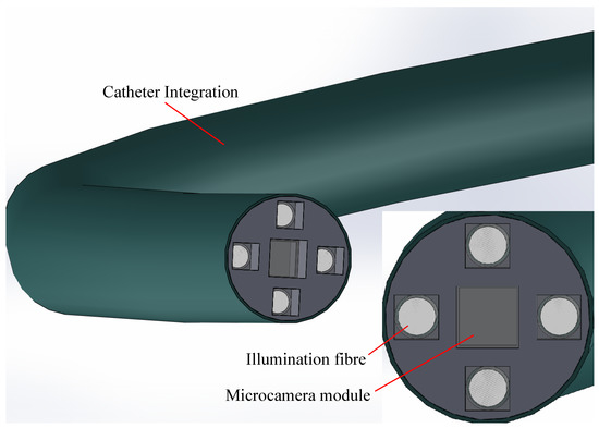 Schematic representation of the miniaturisation possibilities for the two implemented specular-reflection-reduction methods. In this case, a smaller camera sensor OV6948 will be utilised with 0.50 mm and 0.70 mm polarisers integrated in front of the sensor and the 0.40 mm illumination fibres.