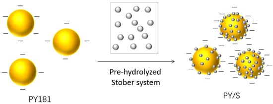 In this study, the modification process of PY181 is illustrated in Figure 1 and Figure 2. Initially, a Si(OH)4 monomer was hydrolyzed by tetraethyl orthosilicate (TEOS), which further condensed to form soluble condensates in the solution. These condensates agglomerated and continued to condense into unstable tiny crystal nuclei. At the same time, these soluble condensates could also condense on the surface of large particles to form microcrystals. In a solution with saturated concentration, tetraethyl silicate hydrolyzed silica, and these nanoparticles were deposited on the surface of the yellow particles to form a silicon shell. The shell exhibited good light transmittance, which had little effect on the chrominance of the yellow particles. Additionally, the electronegativity of the particle surface was enhanced due to the introduction of a hydroxyl group by the silica coating.