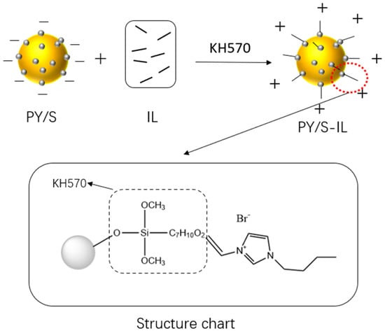 In this study, PY/S particles were modified by grafting an ionic liquid onto their surface. Initially, an “intermediate bridge” known as Y-methylacryloxy propyl trimethoxysilane was anchored onto the surface of the PY/S particles. To achieve this, 0.3 g of PY/S was dispersed into 20 mL of anhydrous ethanol and 3 mL of deionized water, and 1.8 g of a silane coupling agent was added. After agitation for 12 h at 90 °C, PY/S–KH570 particles were obtained. Next, 0.2 g of PY/S–KH570, 0.1 g of 1-vinyl-3-butyl imidazole bromide, and 0.03 g of AIBN were added to 30 mL of acetonitrile, and the IL-grafted modified particles were used. The reaction was stirred for 24 h at 100 °C in a high-pressure reactor, and the unreacted materials were removed by centrifugal washing. Finally, PY/S–IL particles were obtained after drying.