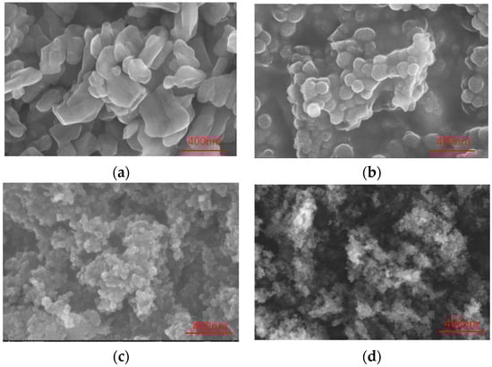 The original PY181 particles, PY/S, PY/S–KH570, and PY/S–IL particles, were dispersed in ethanol using ultrasound for 15 min. The samples were then dropped on the electrode for SEM scanning to observe the changes in particle morphology and coating conditions. The results are presented in Figure 3. Additionally, a dynamic light scatterer was used to determine the mean dispersion size of the particles in ethanol.