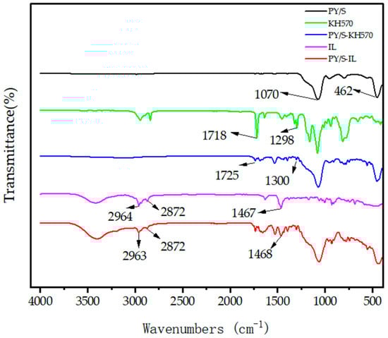 The modification of particles was characterized by FTIR, and the results are shown in Figure 4. The FTIR spectra of PY/S, KH570, PY/S–KH570, IL, and PY/S–IL were analyzed to explore the changes in functional groups before and after particle modification. In the FTIR spectrum of PY/S, characteristic absorption peaks were observed near 1070 cm−1 and 462 cm−1, which corresponded to the anti-symmetric stretching vibration peak of the Si–O–Si bond and the symmetric stretching vibration peak of the Si–O bond, respectively. The characteristic peaks of KH570 in the FTIR spectrum were numerous and mixed due to its liquid nature. However, characteristic absorption peaks appeared at 1718 cm−1 and 1298 cm−1, indicating successful reaction with the silica shell’s hydroxyl group and grafting onto PY/S to form PY/S–KH570. The FTIR spectrum of IL showed characteristic absorption peaks at 2964 cm−1 and 2872 cm−1, corresponding to the tensile vibration peak of C–H in the alkyl; 1467 cm−1, representing the plane bending vibration peak of methyl and methylene; and 1632 cm−1, which was the C=C stretching vibration peak of olefin. In the FTIR spectrum of PY/S–IL, characteristic absorption peaks of both KH570 and IL were observed, indicating the successful grafting of KH570 and IL onto the PY/S particles coated with SiO2.