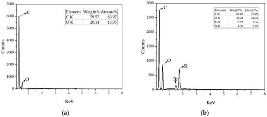 As shown in Figure 5, the elemental compositions of unmodified PY and PY/S–IL were analyzed by an energy spectrum, and the experimental results of the two samples were compared. Similarly, both samples contained the elements of C and O, and the difference was that, compared with PY (Figure 5a), the apparent energy spectra of Br and Si elements appeared in PY/S–IL (Figure 5b). The appearance of the Si element was due to the presence of SiO2 wrapped in PY181, and the presence of the Br element was due to the presence of Br in IL.