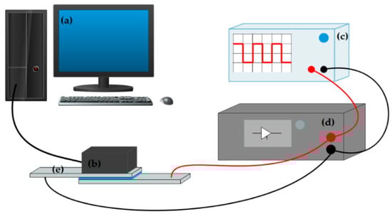 Electrophoresis test platform: (a) computer, (b) colorimeter, (c) oscilloscope, (d) voltage amplifier, and (e) electrophoresis tank.