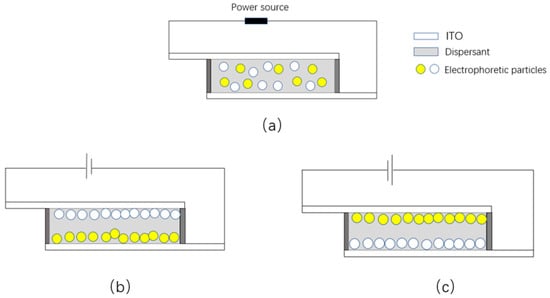 Schematic diagram of yellow–white two-color electrophoretic display: (a) no voltage applied, (b) a display with positive upper plate, and (c) a display with negative upper plate.
