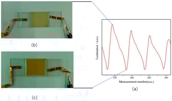 In order to conduct the electrophoretic testing, the EPD container was filled with the electrophoretic solution to be tested. During testing, the colorimeter was used to take white as the reference color. A square wave voltage with a period of 5 s and a size of 5 V was selected for the oscilloscope, which was then amplified ten times by the voltage amplifier and applied to the EPD. The data collected by the colorimeter were input into a computer, and real-time changes were observed through Admesy, the software supported by the colorimeter. The results of the test are presented in Figure 8a, where the x-axis represents the number of measurement points of the colorimeter, and the y-axis represents the surface brightness of the display. When a voltage of +50 V was applied to the upper plate, the white titanium dioxide particle moved upward to the plate due to its negative charge, leading to an increase in the measured brightness of the display, as shown by the rise of the Y-axis. At this point, the yellow PY/S–IL particle turned white on the lower plate, as shown in Figure 8b. When the upper plate was negatively charged, the yellow PY/S–IL particle moved up the plate due to its positive charge, leading to a decrease in the display’s brightness, as indicated by the decrease in the Y-axis, and the display turned yellow, as shown in Figure 8c.