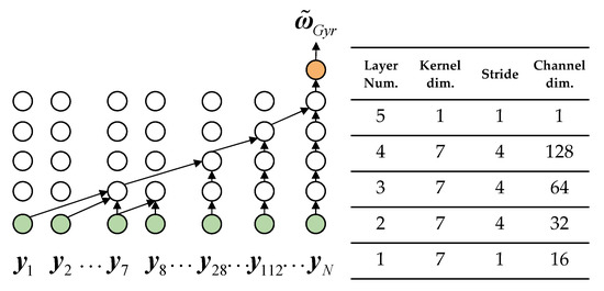where neural network is similar to the network structure proposed by Brossard [34]. It is mainly composed of a five-layer 1D-CNN. The time series is processed by inputting N data frames before k time, and the sequence is serialized by padding zeros at the beginning of the sequence. Different expansion values are set in each layer of the CNN so that the receptive field of the highest layer can cover the entire sequence, and the entire network can realize the time window of N = 448. The CNN’s convolution kernel parameters gradually increase with the number of layers to achieve high-dimensional feature extraction, setting the Batch Normalization layer and Dropout layer after each layer to alleviate overfitting and using the GELU activation function to achieve nonlinear output. The structure and parameters of the network are shown in Figure 1.