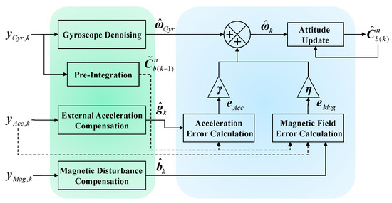However, in practical scenarios, the accelerometer data represent the resultant vector of the carrier’s acceleration, which includes not only gravitational but also external acceleration generated by motion and vibrations caused by collisions. These interfering factors are ubiquitous during movement and are difficult to eliminate through modeling or other means due to their random nature [11]. Similarly, the actual data obtained using the magnetometer represent the resultant vector of the magnetic field at the carrier, which includes not only the geomagnetic field but also magnetic disturbances caused by ferromagnetic materials in local building structures [12]. These interfering factors vary with the region of use in both magnitude and direction, hindering the accurate measurement of the geomagnetic field. The aforementioned disturbances jointly damage the accurate and reliable estimation of attitude and heading. Therefore, exploring an AHRS algorithm that can mitigate the influence of large external acceleration and magnetic disturbance has become an emerging research direction [13,14,15,16].