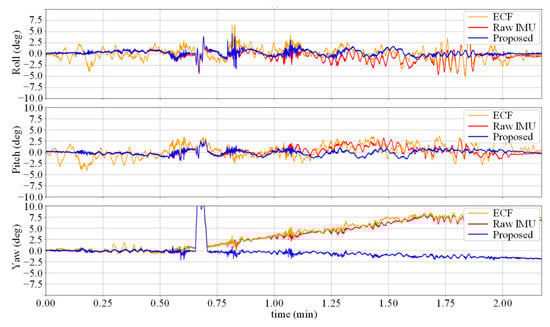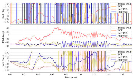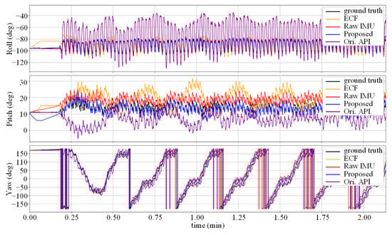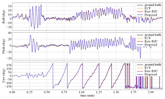 Figure 5 shows the change in the attitude angle in the V1_03 sequence. It can be seen that due to the calibration information of the accelerometer, the error of the ECF attitude estimation is reduced compared to the Raw IMU method, but there is still a certain distance from the true value. The noise-reduction neural network suffers from severe movements, such as rapid turning, when the accuracy decreases, which causes the gap between the yaw angle curve in the figure and the true value at the peak.