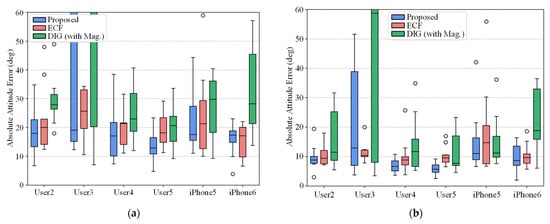 In order to evaluate the robustness of our model on unseen sequences, considering the scenarios of commercial applications, we have adopted a set of tests using sequences from different users and devices provided by the OxIOD dataset. We use the trained model from Section 4.4, which used the dataset collected by User1 using an iPhone 7 Plus smartphone, with the test set comprised of four different users and two different smartphone devices. The results of AAE and AYE of the test sequences are visualized in Figure 7. We have also provided the results of trained nine-axis input version of DIG and ECF which parameters are optimized in training sequences for comparison.