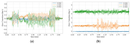 Leveraging the aforementioned common calibration models, we transform Equations (9)–(11) and obtain the denoised angular velocity as