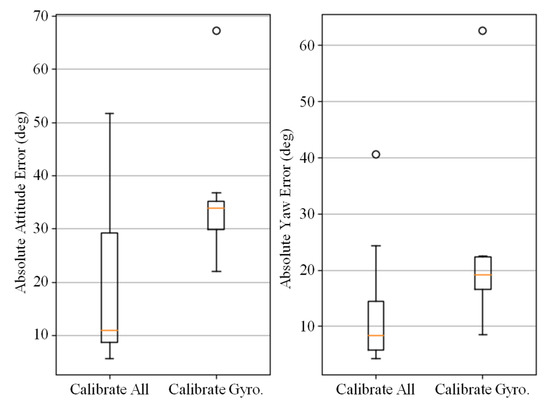 Comparison of Calibrate IMU method with all error terms calibrated and only the gyroscope errors calibrated. The errors are expressed in AAE (left) and AYE (right).