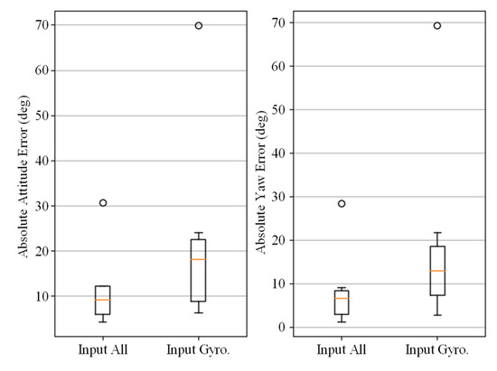 As Equation (15) stated, the input data for the six-axis IMU are , and for the nine-axis IMU are . It is important to include accelerometer and magnetometer data since the change in acceleration and magnetic field can also contain information for an incremental change in attitude. When the carrier is moving slowly and has no magnetic disturbance, the acceleration and magnetic field in the b-frame can be stated as