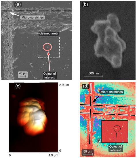SEM image of grid lines (micro-scratches) made on the glass substrate and location of the cleaned area (a), SEM (b) and 3D-AFM (c) images of SP. COM image (d) of the sample in reflection mode with highlighted insert “F” of the cleaned area in luminescence mode, the cleaned area and the SP are clearly visible.