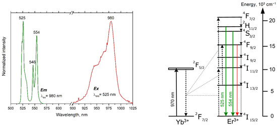 Steady-state luminescence (green) and excitation (red) spectra of the YVO4:Yb, Er LNPE (left). The energy level diagram for the Yb3+-Er3+ upconversion system (right). Solid arrows are radiative transitions; dotted arrows depict cross-relaxation energy transfers and multiphonon relaxation channels.