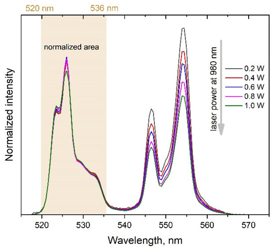 Dependence of the Er3+ emission spectrum on the pump laser power of the YVO4:Yb, Er LNPE. Spectra are normalized to the integral intensity of the 520–536 nm band.